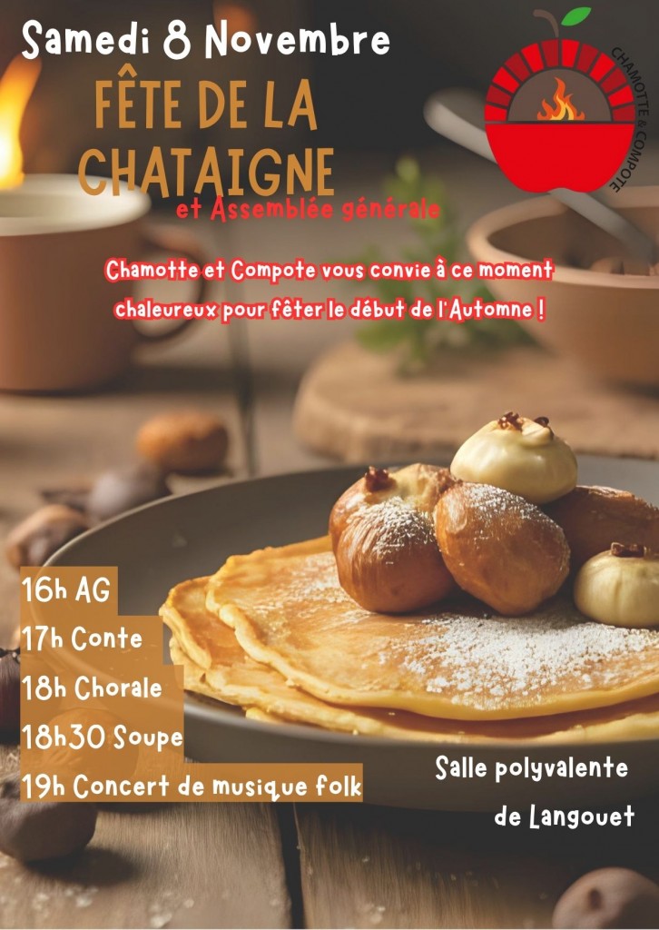 La fête de la chataîgne aura lieu à nouveau à la salle polyvalente de Langouët cette année.On reprend la même formule parce qu'elle plait à plein de monde.Comme chaque année c'est un événement qui réchauffe le coeur et le corps pendant ces premiers jours d'automne. Alors on se donne rendez-vous à :16h pour l'assemblée générale de Chamotte (une personne en plus serait bienvenue)17h pour les contes de Laura (tout public)18h pour les chorales de Langouët à thématique champignon19h pour le bal folk, venez danser !Et si tu veux venir aider tu peux venir dès 10h y aura de quoi faire pour l'installation, déco etc, pendant aussi : griller les chataignes, vendre les crêpes, prendre les adhésions etc. Contacte nous pour nous dire si tu souhaites bénévoler (mail ou 0642028317).A tout bientôt !Porte toi bien !Chamotte & Compote